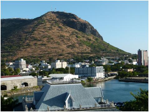 In Mauritius, the people are obviously aware of the dangers of Climate Change. But unlike other small islands such as the Maldives, where President Mohammed Nasheed held an underwater cabinet meeting to emphasize the existential danger, Mauritius didn’t view the danger as immediately threatening to its existence until recently. One of the reasons is the topography of the island that is shown on the map above. The Maldives, the planet’s lowest country, with the lowest natural highest point, faces an impending risk of total submersion. In contrast, the center of Mauritius consists of high mountains (the highest mountain, Piton de la Petite Rivière Noire, is 2700 ft high). The capital, Port-Louis (population – 138,000), is also surrounded by beautiful mountains. The photograph below was taken from the window of my hotel where the conference was held.