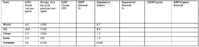 In the table below I ask undergraduates from my course (General Education – no prerequisites) to use primary sources to collect some relevant data about four countries and the World, and to answer a few questions by evaluating this data. I have filled in part of the table with the appropriate data for 2008 – the last year that data were available for the indicators in which I was interested.