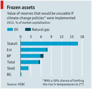 Existing fossil-fuel reserves already contain far more carbon than that. According to the International Energy Agency (IEA),in its “World Energy Outlook”, total proven international reserves contain 2,860GTCO2—almost three times the carbon budget.The report refers to the excess as “unburnable carbon”. Most of the reserves are owned by governments or state energy firms; they could be left in the ground by public-policy choice (ie, if governments took the 2°C target seriously). But the reserves of listed oil companies are different. These are assets developed using money raised from investors who expect are turn. Proven reserves of listed firms contain 762GTCO2—most of what can prudently be burned before 2050. Listed potential reserves have 1,541GTCO2 embedded in them.