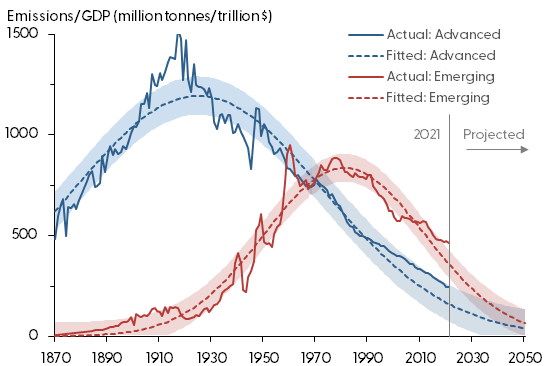The dashed line shows the fit from a bell-shaped curve. We create the curve using three parameters that correspond to the peak intensity, when the peak occurs, and how long it takes for intensity to decline from the peak. The shaded regions are 68% confidence bands, which indicate the uncertainty related to the combination of our parameter estimates and how well the curve fits the data. The figure shows that a bell-shaped curve fits the historical path of emission intensity very well, capturing the rise of world intensity up to the 1920s and the gradual improvement since then.