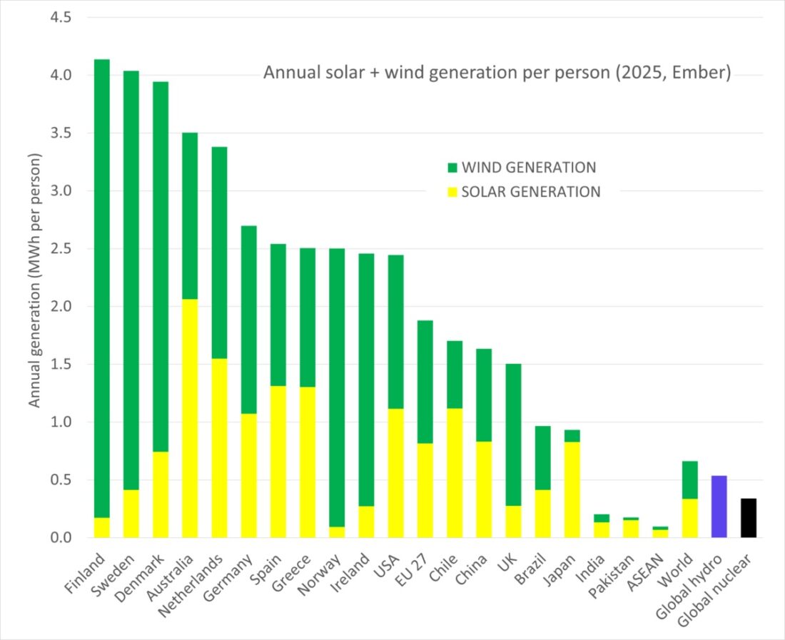 Figure 2 shows the annual solar + wind generation per person of most of the developed countries that continue to march through the transition despite the recent US administration’s path against the stream.